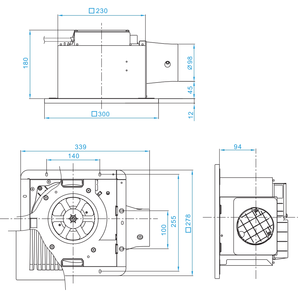 • Cánh quạt hình ngọn nến có khả năng kiểm soát sự thay đổi không khí một cách hiệu quả Kích thước lắp đặt = 240 x 240 mm