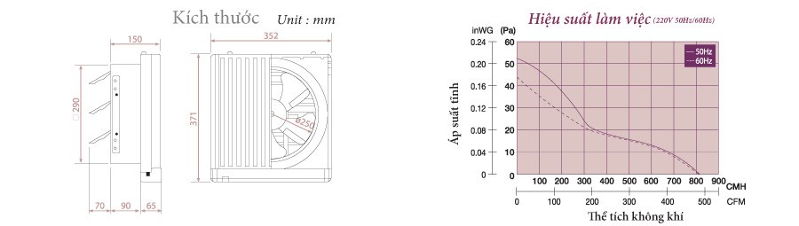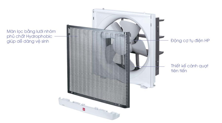 Sản phẩm được lắp đặt và hút không khí qua tường. Model được trang bị cửa chớp bên ngoài sẽ mở ra khi quạt bật và ngược lại.